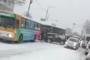 Пассажиры толкали автобус на обледеневшей дороге в Петропавловске
