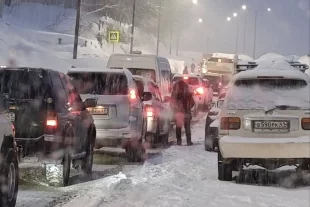 Ситуацию усугубляет снегопад — многие водители едут крайне медленно, а эвакуация сломавшегося автобуса затянулась.