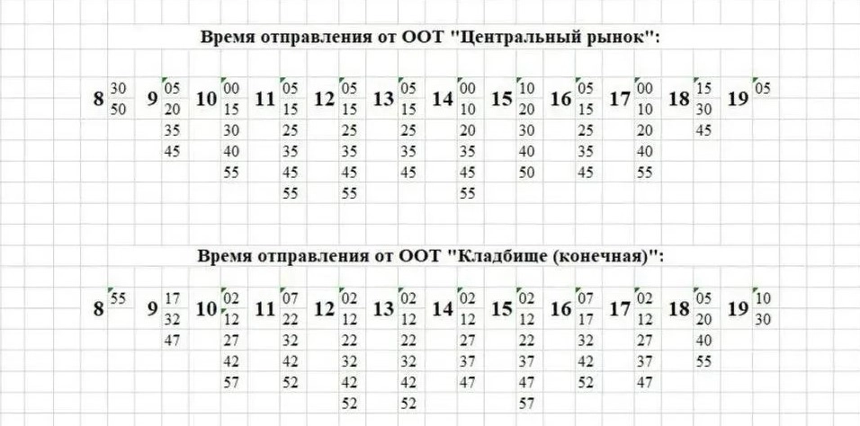 Транспорт будет ходить с интервалом примерно 10–15 минут, однако при дорожных заторах расписание может сдвигаться. Первый рейс отправится в 8:30. Последний автобус от Центрального рынка уйдёт в 19:05, а от кладбища — в 19:30.