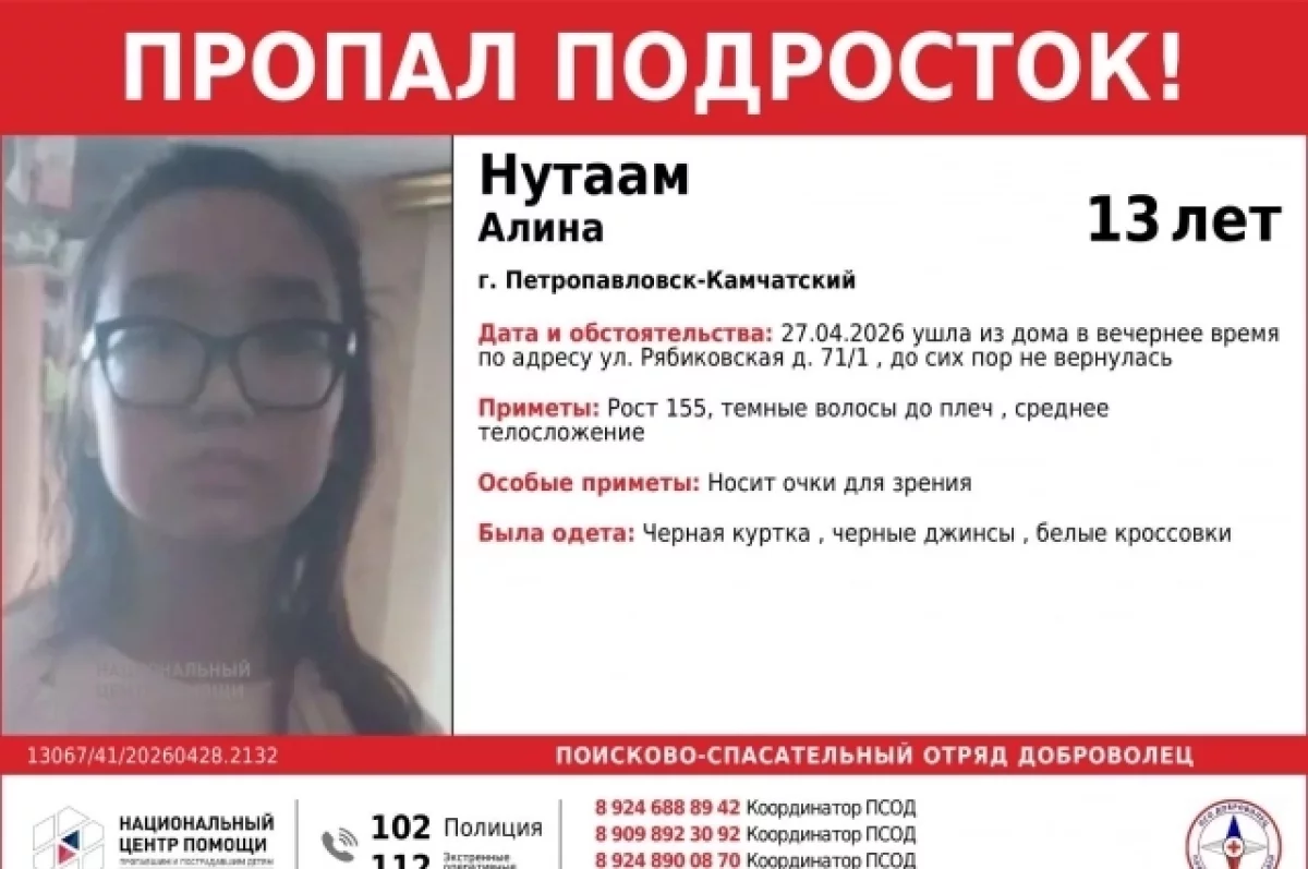В Петропавловске-Камчатском пропала 13-летняя Алина Нутаам, которая вечером 27 апреля ушла из дома по улице Рябиковская 71/1 и до сих пор ее местоположение неизвестно.
