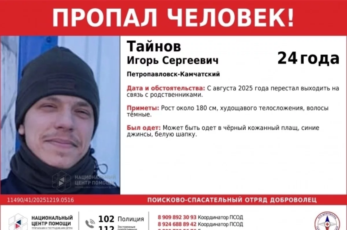 На Камчатке разыскивают 24-летнего Игоря Сергеевича Тайнова. Мужчина перестал выходить на связь с родственниками с августа.