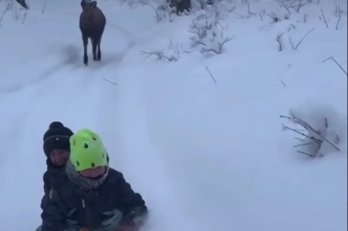 Дети из села Анавгай, Быстринского района зимой развлекаются с ручной лосихой Найденой, сообщает телеграм-канал «Камчатский Север».