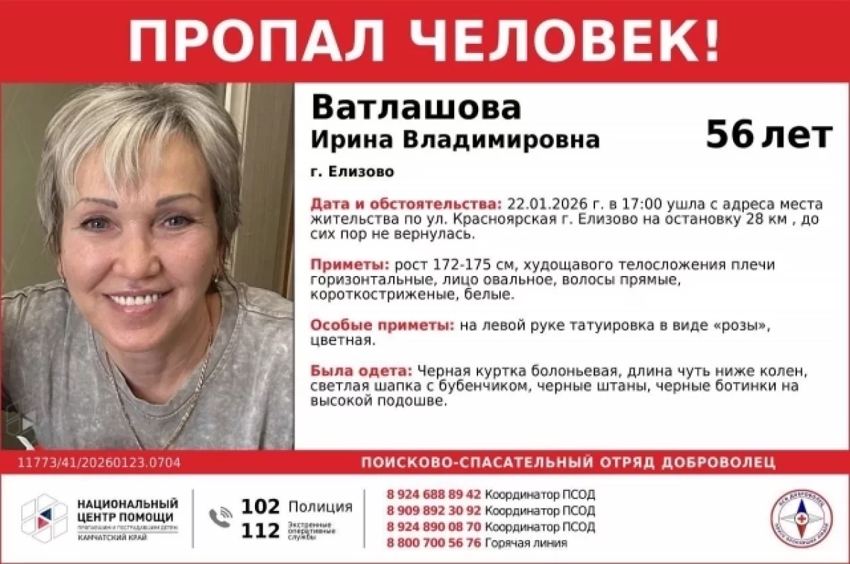 В Елизовском районе Камчатского края разыскивается Ирина Ватлашова. Как сообщают волонтёры, она вышла из своего дома по улице Красноярская в Елизово 22 января около 17:00 и направилась в сторону остановки «28-й километр». С тех пор о её местонахождении ничего не известно.