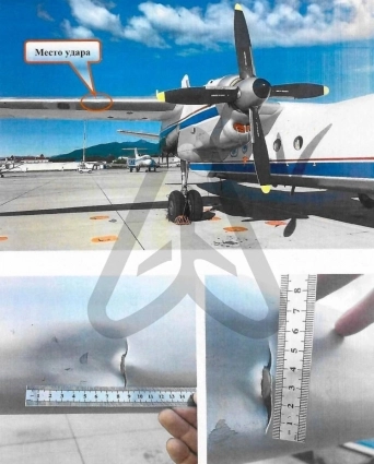 При осмотре в тот же день персонал аэропорта обнаружил на фронтальной обогреваемой кромке воздушного судна вмятину размером 7 на 9 см и глубиной 11 см. Экипаж Ан-26 в показаниях уточнил, что на всех этапах полета они не фиксировали никаких изменений в управлении судном, все системы работали штатно.
