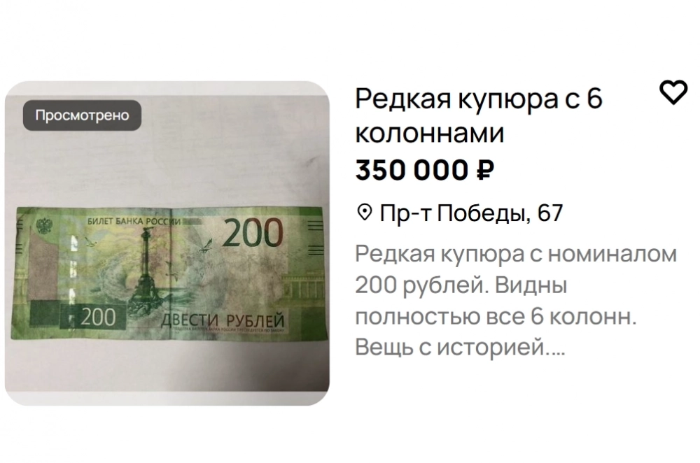 В Петропавловске-Камчатском на одном из маркетплейсов появилось необычное объявление — местная жительница выставил на продажу купюру номиналом 200 рублей за 350 тысяч.