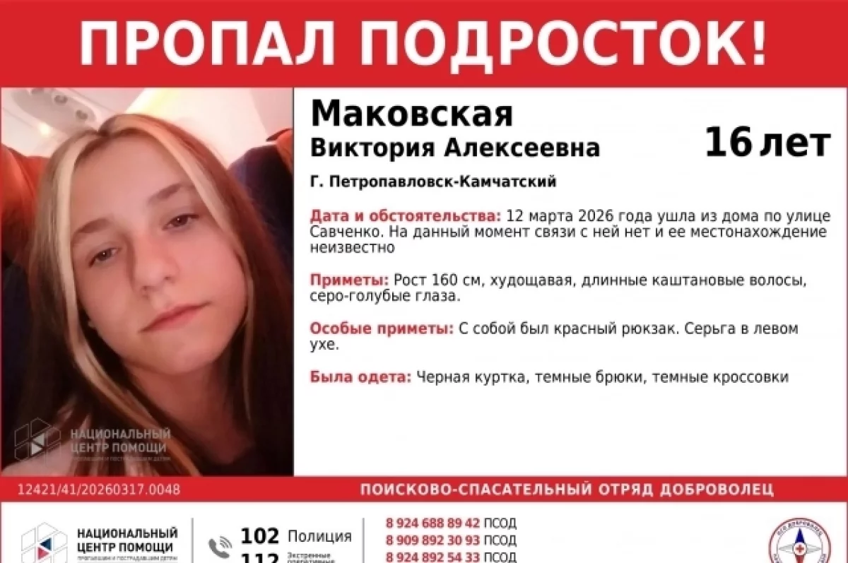 На Камчатке разыскивают 16-летнюю Викторию Маковскую, которая 12 марта ушла из дома по улице Савченко и до настоящего времени не вернулась, связи с ней нет.