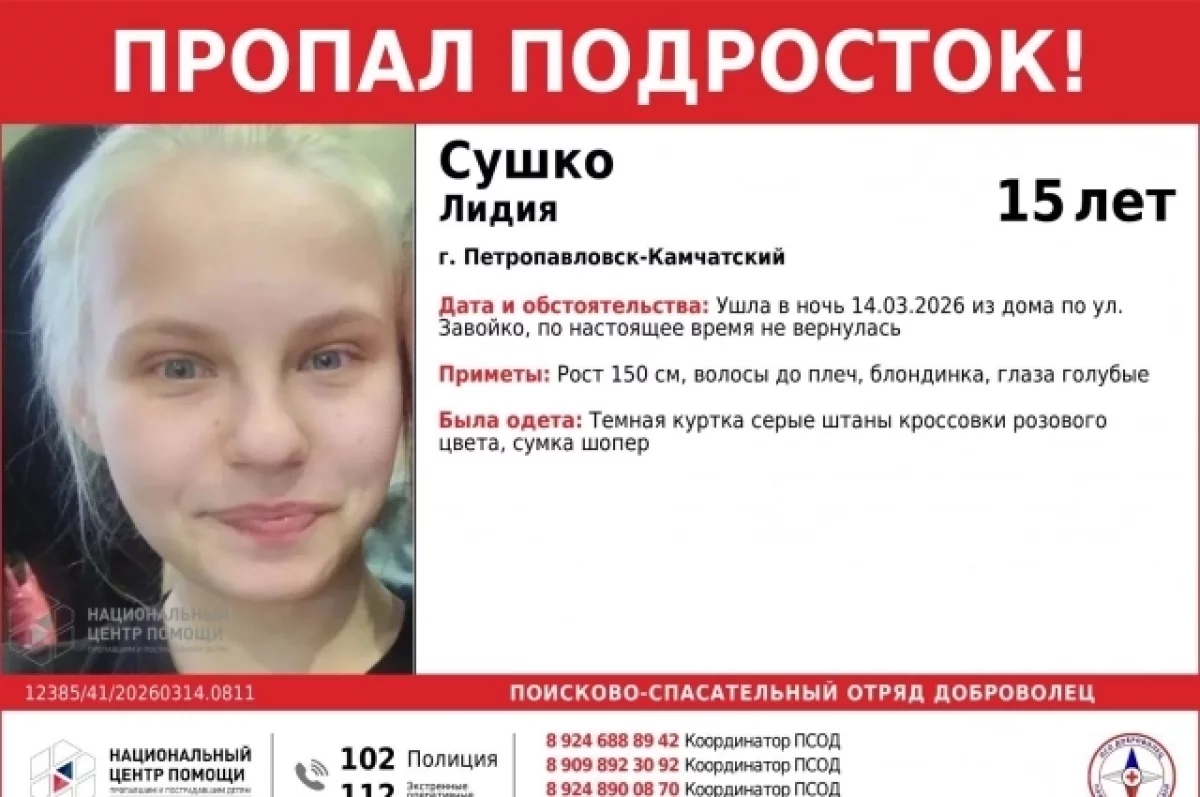 15-летняя девочка-подросток Лидия Сушко ушла из дома по улице Завойко в Петропавловске-Камчатском в ночь на 14 марта и до настоящего времени не вернулась.