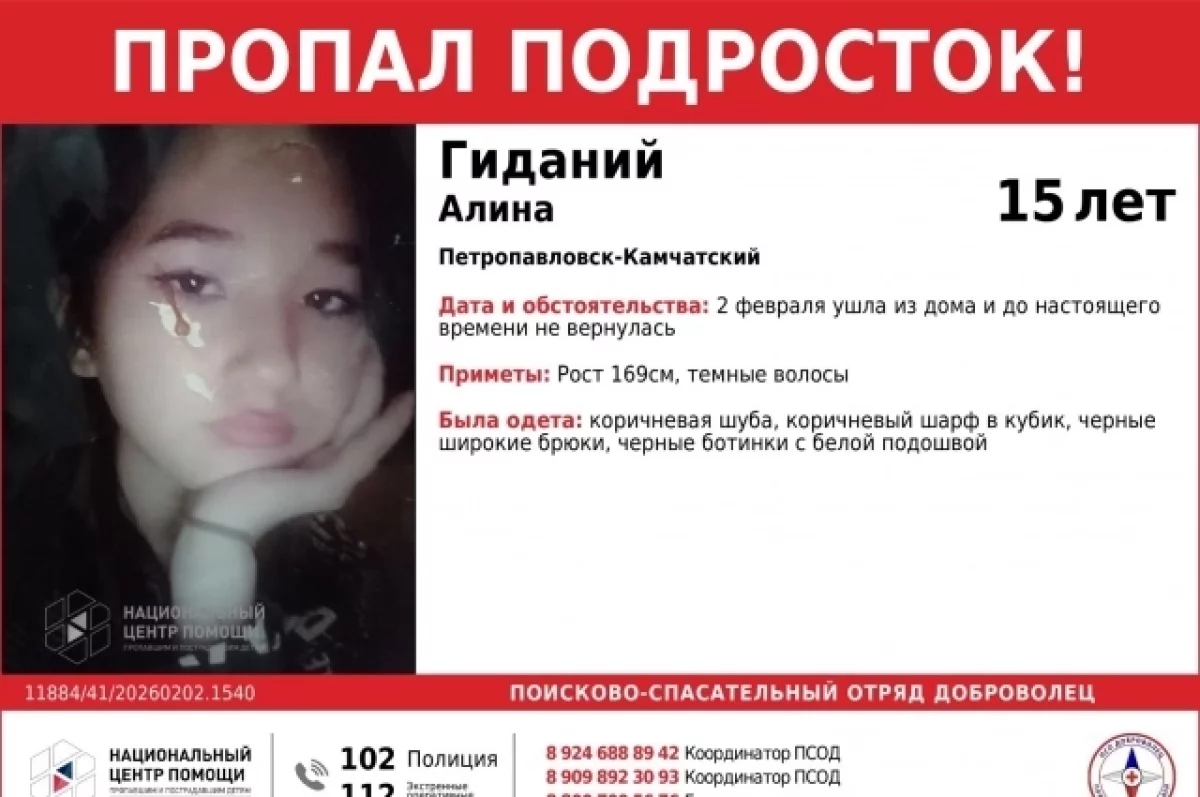 На Камчатке пропала 15-летняя Алина Гиданий, которая 2 февраля ушла из дома и до настоящего времени не вернулась.