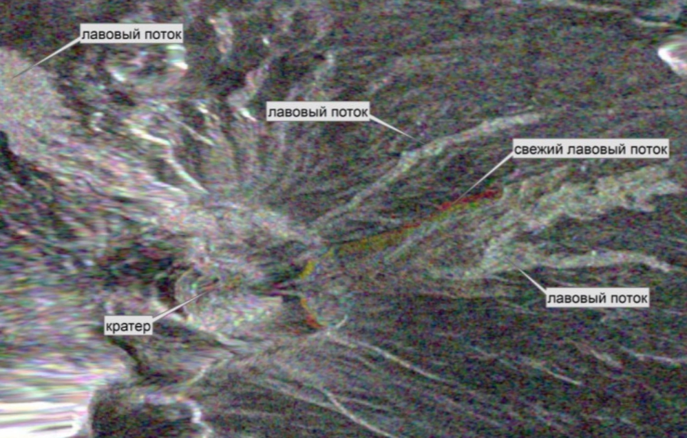 Специалисты сопоставили снимки Sentinel-1 от 14 и 26 февраля. На комбинированном изображении свежая лава выделена красным цветом, более старые потоки — светло-серым. За время извержения лавовые массы неоднократно меняли направление и наслаивались друг на друга.