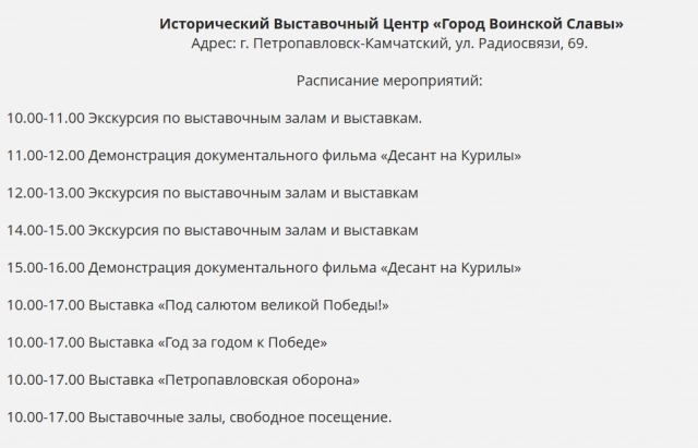 Также запланированы экскурсии, выставки, показы фильмов в Историческом Выставочном Центре «Город Воинской Славы» и в экспозиционном зале «Курильский десант. История подвига».