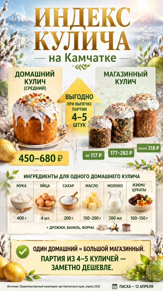 В магазинах Петропавловска-Камчатского и Елизова готовые куличи стоят заметно дешевле при покупке одного изделия. Маленький кулич весом около 150 граммов продают от 117 рублей, средний от 280 до 350 г — от 177 до 282 рублей, а большой весом 550 граммов — около 318 рублей. Более нарядные варианты превышают в цене 400 рублей, авторские на заказ могут доходить в цене до нескольких тысяч.