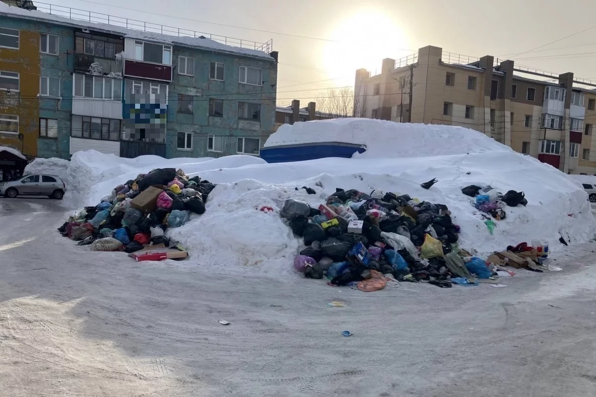 На фотографии, присланной в редакцию kamchatka.aif.ru, видно, что подъездные пути и большая часть двора расчищены от снега, однако в самом его центре сохраняется высокая снежная куча, на которой и вокруг которой скопились десятки пакетов с мусором. Вокруг валяются картонные коробки, пластиковые бутылки, пакеты из-под продуктов и другие отходы. Птицы уже разрывают пакеты в поисках еды, мусор разлетается по снегу.